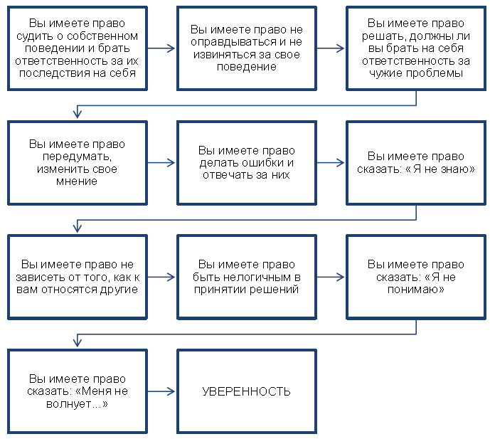 Первый шаг обретения уверенности в себе – это осознание того, что никто не сможет управлять вашими эмоциями, если вы не допустите этого. Право отстаивать свое мнение – основа для здорового проявления личности в любых человеческих отношениях. Это фундамент, на котором мы создаем позитивные отношения с людьми – такие, как доверие, сострадание, теплота, близость, любовь. Права личности придают нам уверенность в себе. В основе бесспорных и неотъемлемых прав личности лежат следующие положения: мы – люди; мы несем ответственность за самих себя и за наше собственное благополучие. Давайте рассмотрим наше главное право, из которого вытекают все остальные. Человек имеет право быть последним судьей над самим собой и над своими поступками (рис. 3).