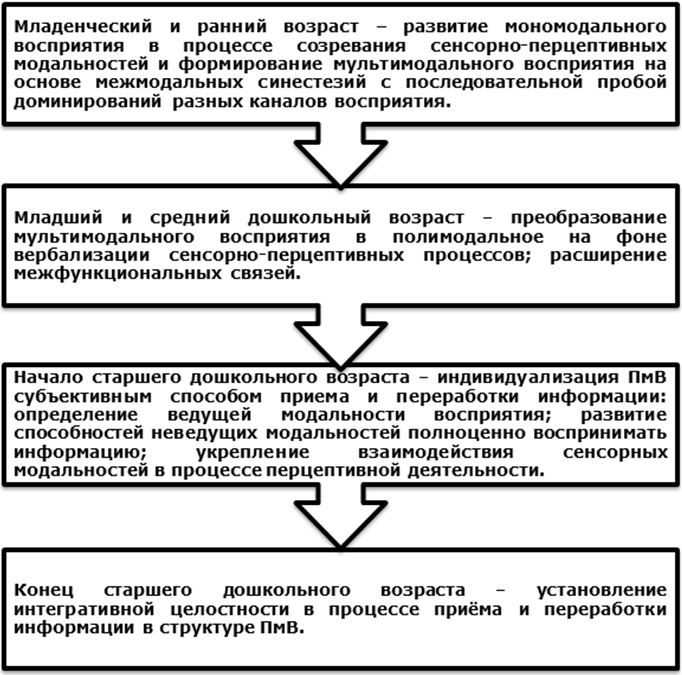 В схеме, отражающей закономерности формирования полимодального восприятия в онтогенезе от младенческого к старшему дошкольному возрасту, представленной на рисунке 1.1, показана последовательность: от мономодальной к мультимодальной и только затем – к полимодальной переработке сенсорно-перцептивной информации.