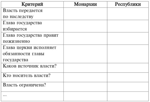 14. Заполните таблицу. Отметьте, выполняются ли данные критерии в случае монархий и республик.