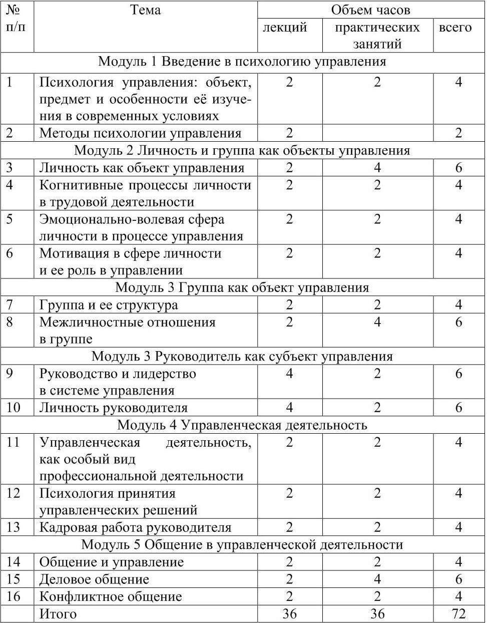 Таблица 1 ─ Тематический план курса «Психология управления»