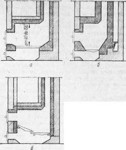Высота топливника зависит от вида топлива. При использовании дров она колеблется от 420 до 1000 мм, считая от колосниковой решетки (от 6 до 15 рядов кладки). Колосниковую решетку укладывают обычно на 1–2 ряда ниже уровня топочной дверцы с тем, чтобы при ее открывания горящие угли не выпадали на пол. Иногда колосниковую решетку устанавливают с наклоном, при котором задняя часть ее выше передней на 4–5 см. Такой подъем пода обеспечивает более равномерное горение топлива и отделенно пламени от дыма (рис. 1, а).