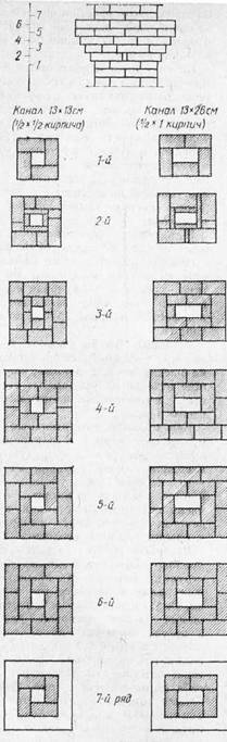 Как правило, размеры каналов кратны размеру кирпича и обычно равны 260x130 мм (1х №/2 кирпича) или 130 х 130 мм (№/2 х №/2 кирпича). Площадь сечения каналов дымооборотов также должна быть согласована с тепловой производительностью печи. При чрезмерно большом их сечении печь недостаточно разогреется, при слишком малом – будет дымить. Опыт говорит, что дымообороты при теплоотдаче печи до 3000 ккал/ч должны иметь сечение 170–250 см2, а при теплоотдаче 3000–5000 ккал/ч – 250–300 смІ.