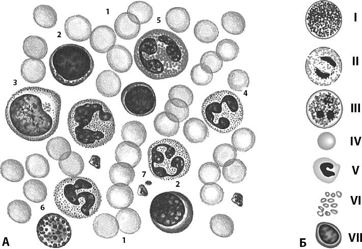 А – мазок периферической крови взрослого человека (общий вид): 1 – эритроциты; 2 – лимфоциты; 3 – моноцит; 4 – нейтрофильные гранулоциты; 5 – эозинофильные гранулоциты; 6 – базофильные гранулоциты; 7 – тромбоциты; Б – клетки крови: I – базофильный гранулоцит; II – ацидофильный гранулоцит; III – сегментоядерный нейтрофильный гранулоцит; IV – эритроцит; V – моноцит; VI – тромбоциты; VII – лимфоцит