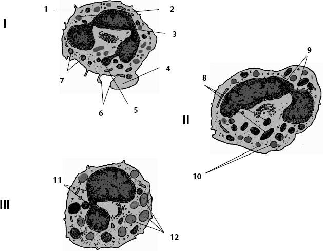 I – сегментоядерный нейтрофильный гранулоцит; 1 – вторичные (специфические) гранулы; 2 – первичные (азурофильные) гранулы; 3 – сегменты ядра; 4 – периферическая зона, не содержащая органелл; 5 – тельце полового хроматина; 6 – микроворсинки и псевдоподии; 7 – вторичные (специфические) гранулы; II – ‘озинофильный (ацидофильный) гранулоцит 8 – зрелые специфические гранулы, содержащие кристаллоиды; 9 – сегменты ядра; 10 – первичные (азурофильные) гранулы; III – базофильный гранулоцит; 11 – сегменты ядра; 12 – гранулы базофила различной величины и плотности