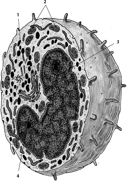 1 – лизосома; 2 – митохондрия; 3 – ядро; 4 – комплекс Гольджи