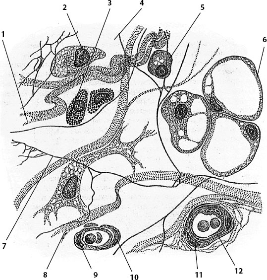 1 – коллагеновое волокно; 2 – макрофагоцит; 3 – тканевый базофил; 4 – аморфное межклеточное (основное) вещество; 5 – плазмоцит (плазматическая клетка); 6 – адипоцит (жировая клетка); 7 – эластическое волокно; 8 – фибробласт; 9 – эндотелиоцит; 10 – перицит; 11 – миоцит; 12 – кровеносный сосуд
