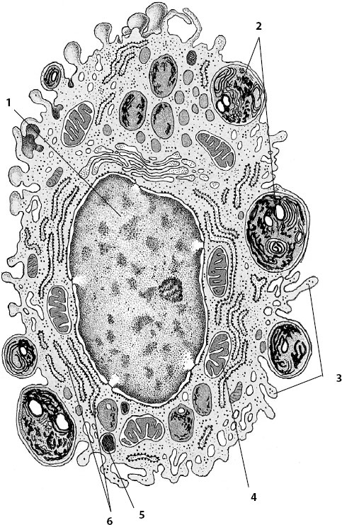 1 – ядро; 2 – фаголизосомы (вторичные лизосомы); 3 – псевдоподии; 4 – митохондрия; 5 – остаточное тельце; 6 – цистерны гранулярной эндоплазматической сети