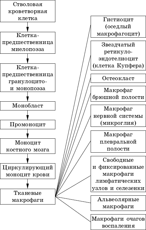 Рис. 28. Происхождение и структура системы мононуклеарных фагоцитов (СМФ)