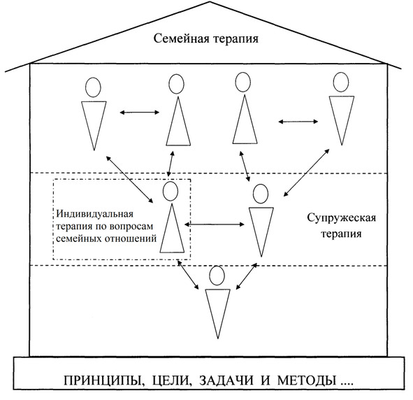 Здание семейной терапии с самостоятельными блоками «супружеской терапии» и «индивидуальной терапии по вопросам семейных отношений» опирается на общий фундамент. Таким фундаментом являются теории семейной терапии, принципы и цели семейной терапии.