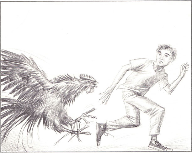Бегал я и вообще-то быстро, а тут… Ветер свистел в ушах, тело как бы потеряло вес и в то же время приобрело особую чувствительность. Мне казалось, что петушиный клюв вот-вот вопьется в мой худощавый зад… Или в позвоночник… И пробьет его насквозь. Я упаду, а разъярённая птица прижмет меня могучими когтями и начнет терзать.
