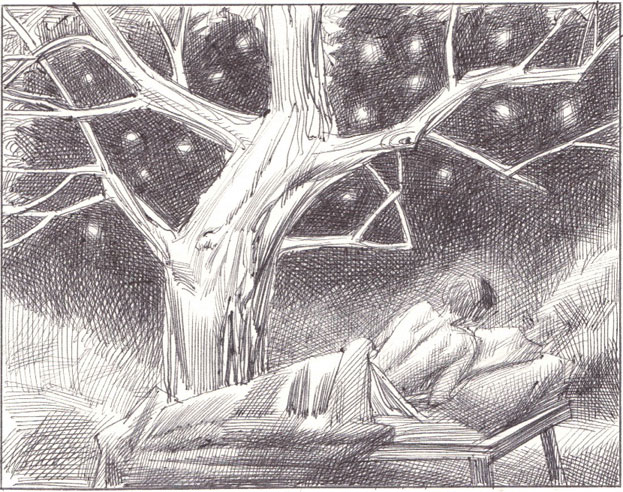 Ночь тихая-тихая. Слышен лишь звон цикад, негромкий, будто и они боятся нарушить тишину и нежно так шелестят в ночной мгле. Свет тусклой лампочки над воротами не доходит до нас, затерявшись в листве деревьев, зато над нами в черном бархатном небе, переливаясь, сияют звезды. Как их много! Миллионы, миллионы миллионов… Они мерцают, словно переговариваясь. Может, не только между собой, но и с нами? Может, это их шелест мы слышим, а вовсе не звон цикад?