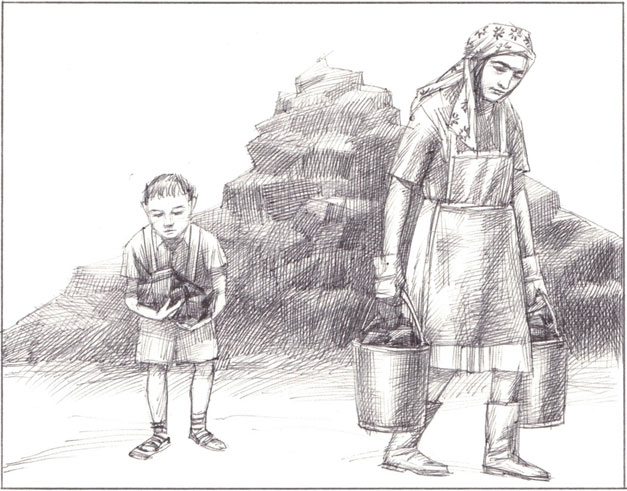 Мать принесла несколько ведер, лопату, и мы с ней взялись за дело. Тяжело ступая, тяжело дыша, носила по два ведра, доверху наполненных углем, мама.