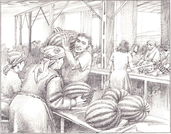 Открывался базар очень рано и сразу же превращался в некое подобие пчелиного улья. И гудел базар монотонно, как пчелиный рой, а над этим однообразным низким гулом то и дело взмывали высокие, тонкие голоса. Это неутомимые продавцы зазывали покупателей.