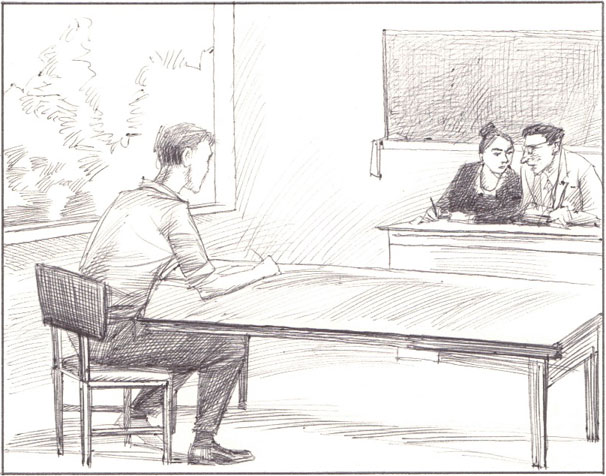 По всему залу, по три в ряд, расставлены длинные столы, аккуратно застеленные калькой. За каждым столом всего два человека: у одного угла и у другого угла. Даже и не пошепчешься. Я, кстати, сижу в крайнем ряду, возле огромного окна, и это очень приятно: окно распахнуто, легкий ветерок, как ласковая рука, треплет меня по щеке и говорит: «Спокойно, спокойно…»