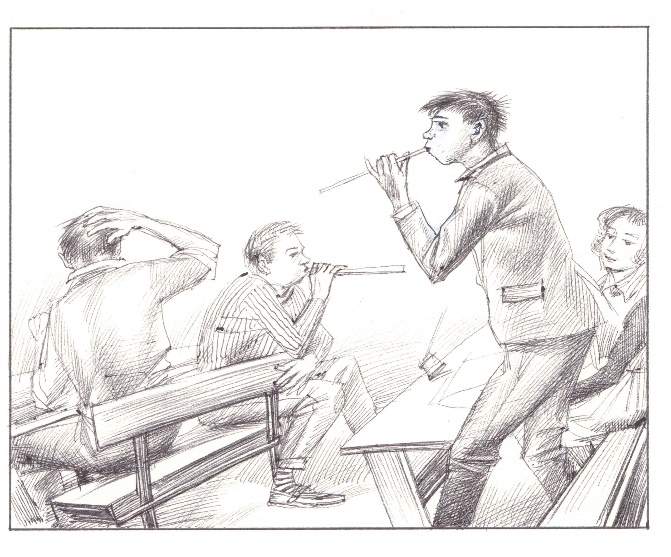 Most of the shooters sat in the back of the classroom. The backs of the heads of those who sat up front were perfect targets. Poor things – they not only couldn’t shoot back, they couldn’t even shout “ouch,” as I had just done. But it hurt when a wad of blotting paper hit you on the back of the head. And our shooters were skillful. After inhaling deeply and pressing their lips around a tube, they spit a bullet through it with all their might. Phooey! And the air, like an exploding capsule, pushed the bullet rapidly out of the paper tube.