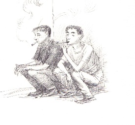 Everyone was already smoking, some of them leaning against the wall, others either squatting or walking back and forth, joining small groups involved in lively conversations.