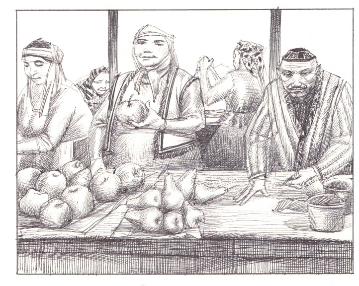 * * *As we were leaving the bazaar, we walked along the outer rows, which weren’t crowded. A group of babais – that was how we jokingly called elderly Uzbeks and Kazakhs – had made themselves comfortable in the shade of an apple tree near the fence. They sat cross-legged on a mat and talked unhurriedly and calmly as if there had not been a noisy city bazaar around them but rather meadows surrounded by mountains. Yes, they were shepherds, which was clear from their appearance – they all had moustaches and beards, with shaggy hats on their heads, dressed in long chapans, which covered their boots. There was a teapot on the mat in front of them, and each of them held in his hands a bowl with steam rising from it. Some of them sipped tea, other enjoyed nasvayem, chewing tobacco that one placed under the tongue. And, of course, there were horse-hide containers nearby filled with kumis.