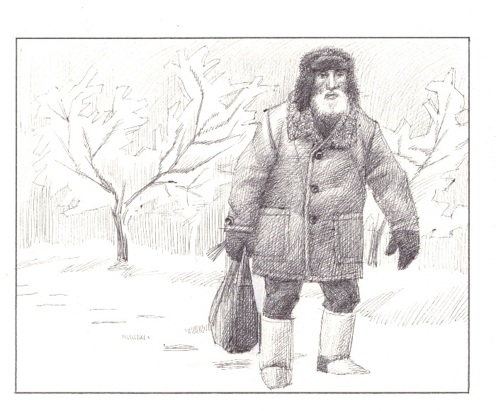 I hurried to the hallway. Grandpa stood obediently at the front door. His cap with the earflaps was pulled down over his eyebrows, and he looked funny. His beard looked like a snowball stuck to his chin.