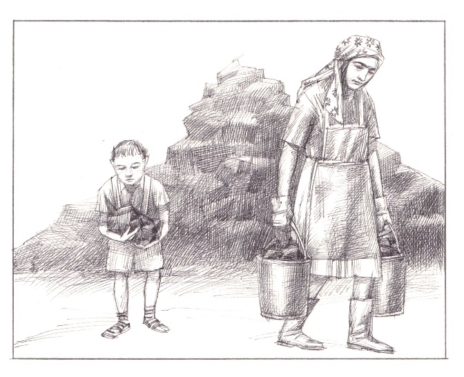 Mama brought a few pails and a shovel, and we set to work. Mama carried two pails filled to the brim with coal, panting and walking heavily. I followed her carrying the two or three pieces that I could lift.