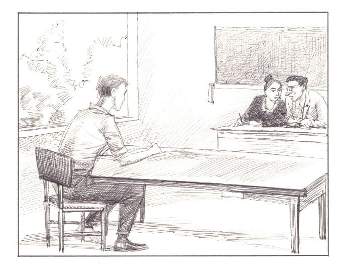 Long tables carefully covered with tracing paper were arranged in three rows around the auditorium. There were just two students at each of the tables, sitting at opposite ends. Not even a chance to whisper to each other. I, by the way, was sitting in the row near the huge window, which was very pleasant. The window had been thrown open, and a light breeze, like a tender hand, patted me on the cheek, saying, “Calm down, calm down…”