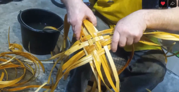 размочили бересту в горячей воде, чтобы она была пластична и продолжаем заплетать все наши, все наши кавычки по своей строке.