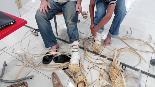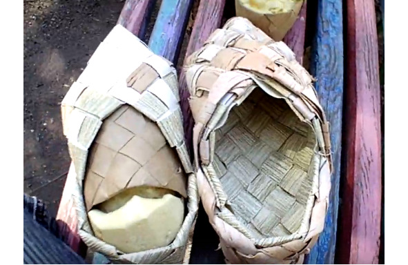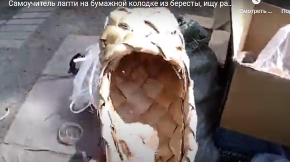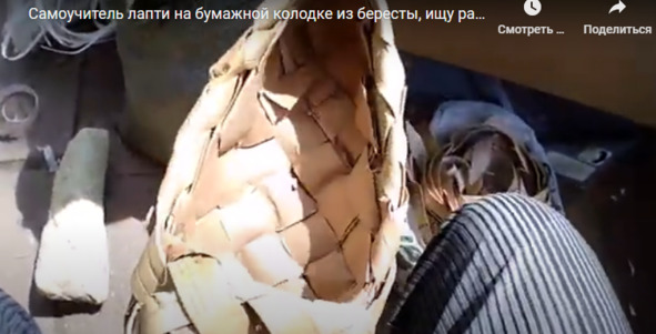 Из бумажных лаптей получаются лапти из бересты. Для этого используется колодочка по размеру заказчика. Сначала она бумажная, а потом по бумаге пробивается берестой короткой по одной лычке. В результате получаются лапти из бересты.