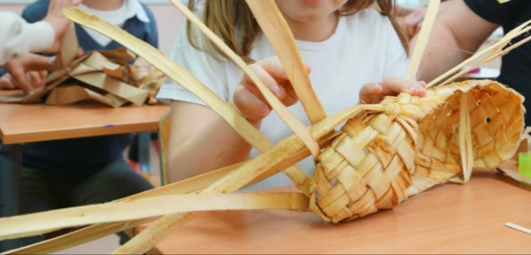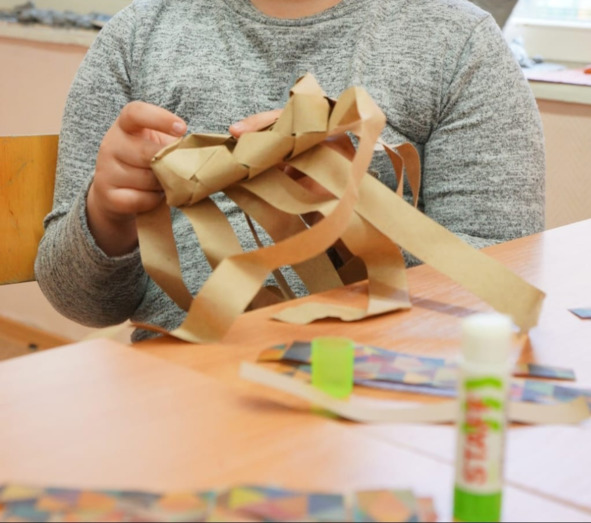 Нарезание бумажных лент под руководством мастера. Демонстрация мастером начального этапа плетения, после которого участники продолжают работу самостоятельно. Детям и взрослым предоставляется возможность доплести лапти до конца, используя предложенную технику и собственные творческие решения.
