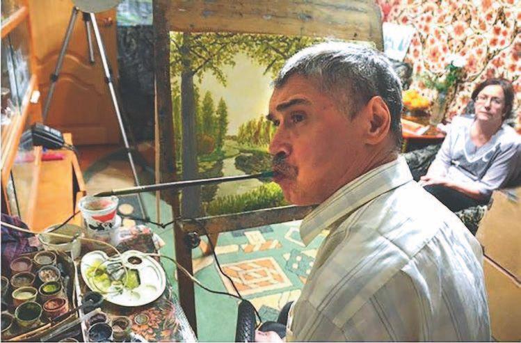 Владимир Набатов инвалид с детства, у него парализованы руки и ноги, но есть светлая голова и горячее сердце. Он пишет восхитительные картины, держа кисть в зубах и направляя ее поворотом головы. Здесь на фото он вместе со своей Надеждой, которая ему и жена, и сиделка, и муза. Я дорожу дружбой с этими замечательными людьми – творцами своего счастья и творцами красоты.