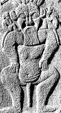 Википедия: Барельеф с изображением Беса, северные ворота цитадели хеттской крепости Каратепе (VIII в. до н. э.)