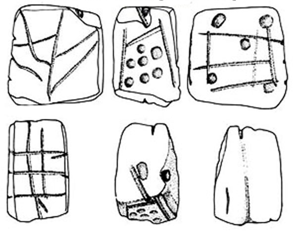 На объекте были найдены два каменных кубика с круглыми отметинами и процарапанными линиями. Вполне возможно их использовали не для игры, а для «священного жребия».