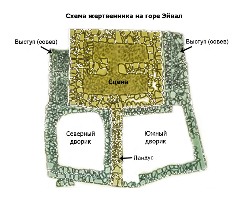 На горе Эйвал, примерно 3200 лет назад, священники по главному пандусу восходили к алтарю, в середине которого горел огонь. Передвигались по выступу (совев), чтобы не ступать на священную часть жертвенника, они на пол сбрасывали кости и пепел, оставшиеся от жертвенных животных.