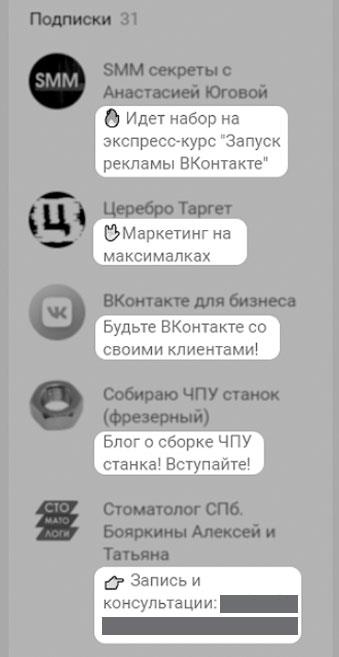 Когда человек смотрит на блок подписок, то он видит всего три элемента: аватарку, название и статус. Он не знает ни вас, ни ваш контент, но ваша задача – убедить сделать клик. Он понимает, что тут идет набор в группу по рекламе в ВКонтакте? Да. Желает изучить? Да, ему интересно. Тогда он делает клик и изучает материал.
