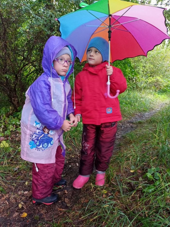 Выбрали момент между дождями и пошли прогуляться. С дождевиками, конечно же, и с таниным рюкзаком, куда постепенно перекочевала половина одежды, потому что оказалось теплее, чем я думала. Таня грозненькая – идет, мечом размахивает, месит грязь и лужи резиновыми сапогами, на зависть Махе. Для Махи я не нашла еще ортопедических резиновых сапог, а ее ботинки не промокают, даже если в них ходить по лужам, так что технически и незачем. Но Маха все равно периодически говорила: «Таня, хватит резвиться!» Строгая сестра.