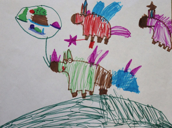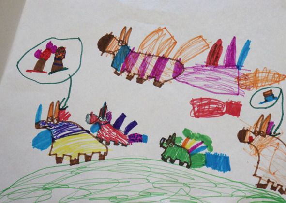 Прочитали про снеговичка. Таня: «не знаю, что мне приснится, но завтра я его нарисую». Завтра она нарисовала не только снеговичка, а много всяких разных существ.