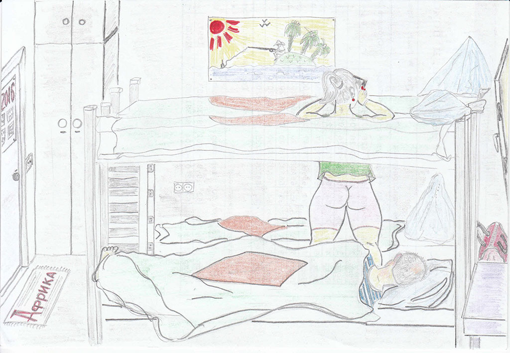 «Африка» – это суперэконом четырехместный номер! В длину четыре метра, в ширину три. С двумя двухъярусными кроватями, с четырьмя высокими металлическими шкафчиками, маленький, еле приметный столик в углу, один стул, ну и… всё! Небольшое окно для проветривания с видом во двор. Все чистое и новое. В хостеле имеется кухня, оборудованная всем необходимым, два туалета, два душа, вместительный холодильник, стиральная машина (стирка 100 рублей), плазма-телевизор. Повторюсь, все новое, только что открылись. Конечно, тесновато жильцам, и все на виду, зато и цена – 600 рублей за койко-место в сутки. Я же был доволен и меня все устраивало!