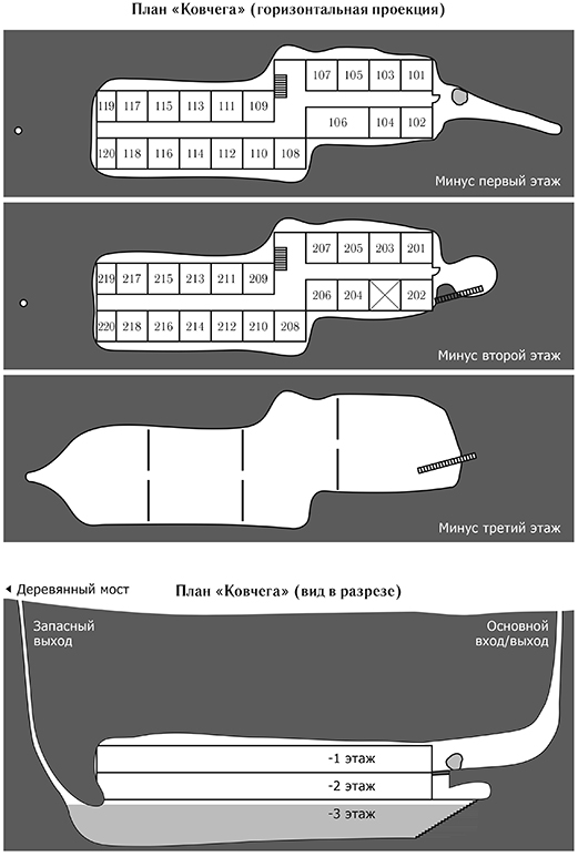 Как мы уже убедились, «Ковчег» – длинный и узкий, с изгибом посередине в виде перевернутой буквы Z – состоял из трех подземных этажей. Судя по чертежу, на минус третьем этаже в отличие от двух верхних комнат не было. Вместо этого он делился на несколько больших помещений. Дверь, через которую мы сюда попали, находилась на западной стороне. На восточной, на уровне минус третьего этажа и правда имелся еще один ход, ведущий на поверхность.