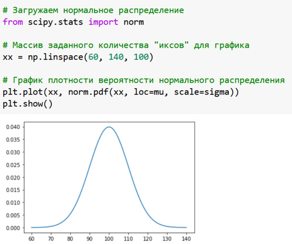 Далее формируем одномерный массив (вектор) из 100 чисел в диапазоне от 60 до 140. В этих пределах расположена наша гистограмма. Для этого используем функцию linspace из библиотеки numpy.