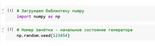 Зададим начальное состояние генератора случайных чисел. Вызываем функцию seed из встроенного модуля random. В качестве параметра укажем номер зачетной книжки, см. рис. Задавая одно и то же начальное состояние генератора, мы будет каждый раз получать один и тот же набор данных. На самом деле это псевдослучайные числа, которые получают путём вычислений. Внешне они выглядят как случайные.