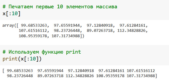 Выводим на экран первые 10 элементов массива x. Мы не указываем начальный индекс, поэтому используется нулевой элемент. После символа двоеточия указан номер 10, но элемент с номером 10 не выводится. Мы увидим только элементы с номерами от нуля до девяти – это особенность Python.