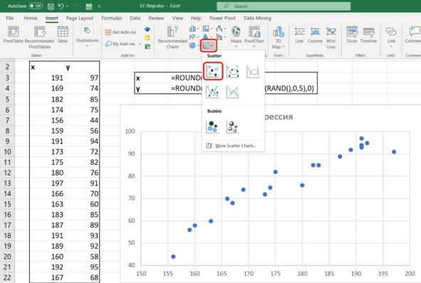 Вам нужно будет построить диаграмму разброса, потом добавить линию регрессии под названием «линия тренда». Затем нажать пару кнопочек, чтобы на экране появилось уравнение связи.
