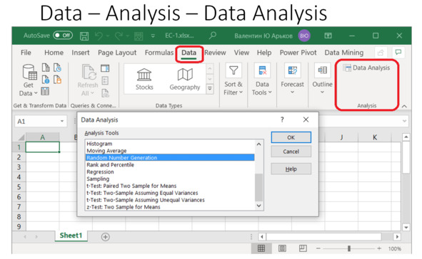 Для дальнейшей работы нам понадобится так называемая надстройка «Анализ данных». Чтобы включить настройку, нужно перейти в меню Файл Настройки – Надстройки: File – Options – Add-ins – Excel Add-ins – Go – Analysis ToolPak, см. рис.