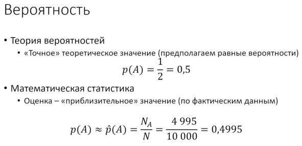 Статистика – это фактические данные. Когда мы переходим к обработке данных, то никогда не видим идеальные числа и идеальные условия. Мы каждый раз видим реальные наборы данных. Например, тысячу раз бросили монетку. Посчитали, сколько раз выпал орёл. Представим, что из десяти тысяч раз почти в половине случаев монетка упала орлом вверх. Делим на общее число бросаний и получаем число, которое будет приближаться вот к теоретическому значению.