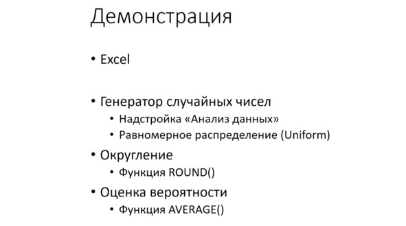 В данном занятии мы посмотрели на так называемые псевдослучайные числа – то есть они на самом деле не совсем случайные. Нам только кажется что они случайные. Генерируется последовательность, которая зависит от начального состояния. Мы увидим этот инструмент и в Excel, и в любых других программных генераторах, в том числе, и в питоне. То есть в Python.