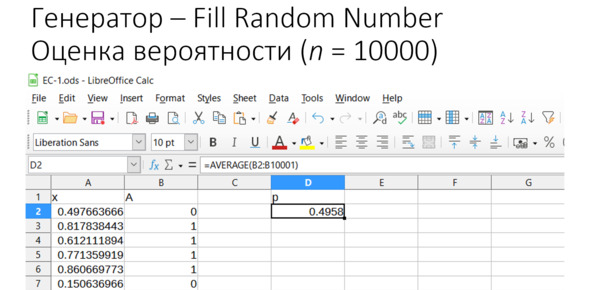 Когда мы вызываем генератор через функцию, электронная таблица пересчитывает все значения при любых изменениях, при обновлении таблицы и при сохранении файла. Все оценки будут вокруг теоретического значения 0,5, но все будут немного разными – плюс-минус.