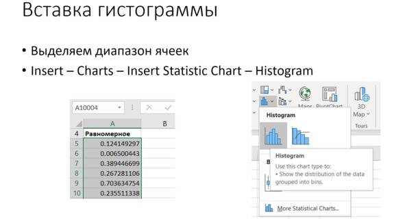 Histogram – это гистограмма, то есть столбиковая диаграмма частот. Частоты считают для сгруппированных данных. Это частота попадания чисел в интервалы (диапазоны значений), см. рис.