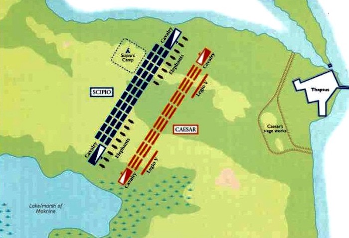 King Juba, informed by Saburra of what had happened during the night, sent him 2000 Gallic and Hispanic knights he normally kept as his bodyguard and that part of his infantry on which he relied most. He himself, along with the rest of the militia and 60 elephants, followed them, albeit at a slower pace. Saburra, trusting in the fact that the Curione himself was approaching as he had sent the cavalry ahead, deployed infantrymen and knights, ordering them to retreat little by little and to pretend fear in retreating: he would give the signal to fight at the most opportune moment and when necessary.