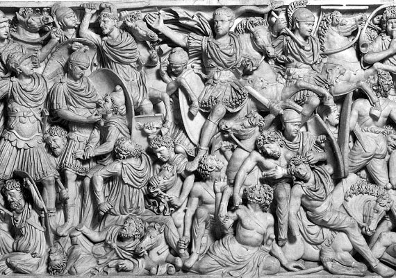 На следующий день Цезарь, оставив для того и другого лагеря достаточное прикрытие, все вспомогательные войска расположил перед малым лагерем на виду у врагов. Эти вспомогательные войска он употребил в дело только для виду, так как численностью легионной пехоты он слишком уступал превосходившему его врагу. А сам он, построив войско в три линии, вплотную подошел к лагерю врагов. Только тогда германцы уже по необходимости вывели из лагеря свои силы и поставили их по племенам на одинаковом расстоянии друг от друга: это были гаруды, маркоманы[29], трибоки[30], вангионы[31], неметы[32], седусии[33] и свебы. Все свое войско они окружили повозками и телегами, чтобы не оставалось никакой надежды на бегство. На них они посадили женщин, которые простирали руки к уходившим в бой и со слезами молили их не предавать их в рабство римлянам.