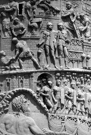 Заметив это, Цезарь приказал отвести в сторону от грузовых судов военные (которые и по своему виду были очень необычными для варваров, и по быстроходности более подходили для подобных операций), дать им быстрый ход на веслах, поставить против незащищенного фланга врагов и на этой позиции отбивать и оттеснять их пращами, стрелами и метательными снарядами. Это распоряжение оказалось для наших очень полезным: самый вид кораблей, движение весел и непривычное действие метательных машин – все это произвело на варваров сильное впечатление; они остановились и несколько подались назад. Но наши солдаты все еще колебались, особенно вследствие глубины моря. Тогда орлоносец 9-го легиона обратился с мольбой к богам, чтобы его поступок принес счастье легиону, и сказал солдатам: прыгайте, солдаты, если не хотите предать орла врагам; а я, во всяком случае, исполню свой долг перед республикой и императором. С этим громким призывом он бросился с корабля и пошел с орлом на врагов. Тогда наши ободрили друг друга и, чтобы не навлекать на себя великого позора, все до одного спрыгнули с корабля; когда это заметили солдаты, находившиеся на ближайших кораблях, они также последовали этому примеру и двинулись на врага.