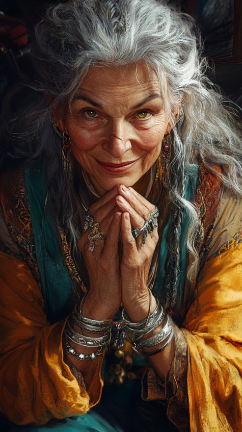 Её облик сразу не понравился Мари: у гадалки было лицо, покрытое морщинами, с длинным крючковатым носом и тонкими губами, изогнутыми в странной усмешке. Её глаза, как два тёмных озера, были окружены глубокими тенями, придавая ей пугающий вид. Волосы, седые и спутанные, спадали на плечи, а яркие одежды контрастировали с её мрачным выражением.