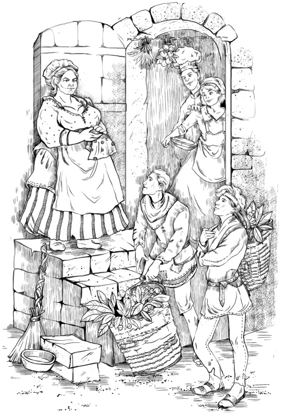 – Ну, вы чего тут разгалделись? Слизь зелёная! Бездельники! Марш работать! А вы – корзины – в холодную, вот туда, потом поешьте, я скажу девкам, и – за водой!